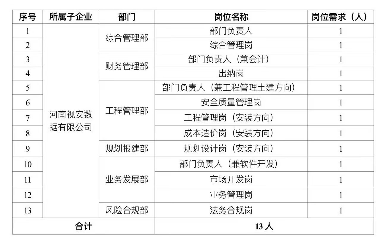 凭据河南金年会物流有限公司事情计划 ,为满足河南视安数据有限公司项目建设运营人才需求 ,确保数字物流综合效劳多式联运智慧枢纽项目建设、仓储、信息化效劳等高铁物流业务顺利实施。现面向社会果真招聘13人 ,有关事宜通告如下: